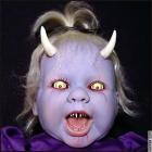 Ed: We start with a regular baby doll, take it apart, and repaint if from the inside out. Teeth and horns are hand sculpted and added, after painting and drying processes. Eyelashes, sealers, and nails are next.