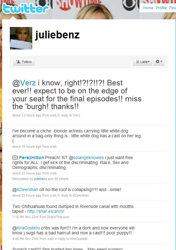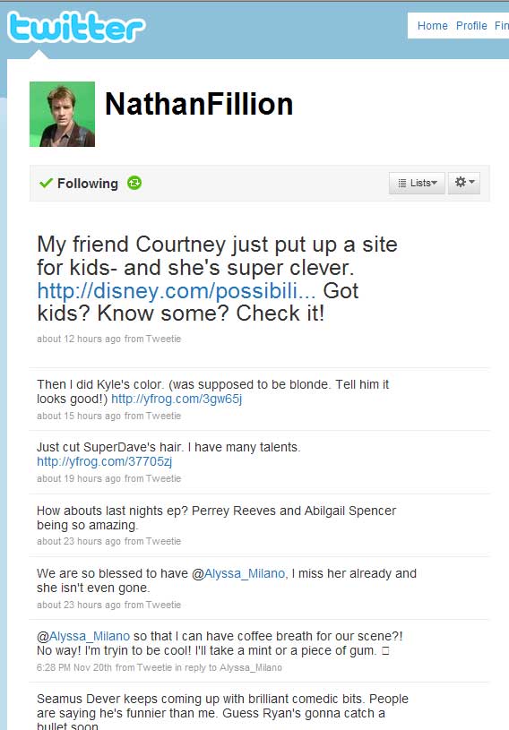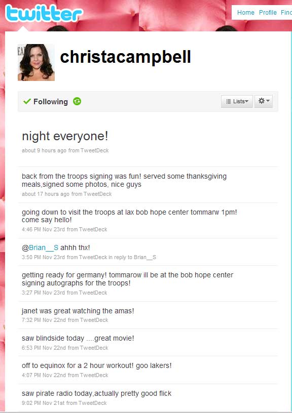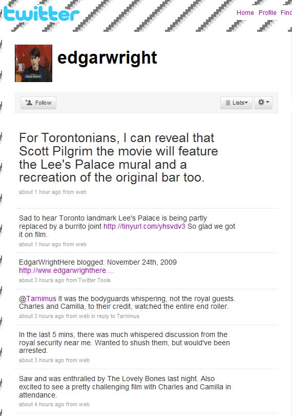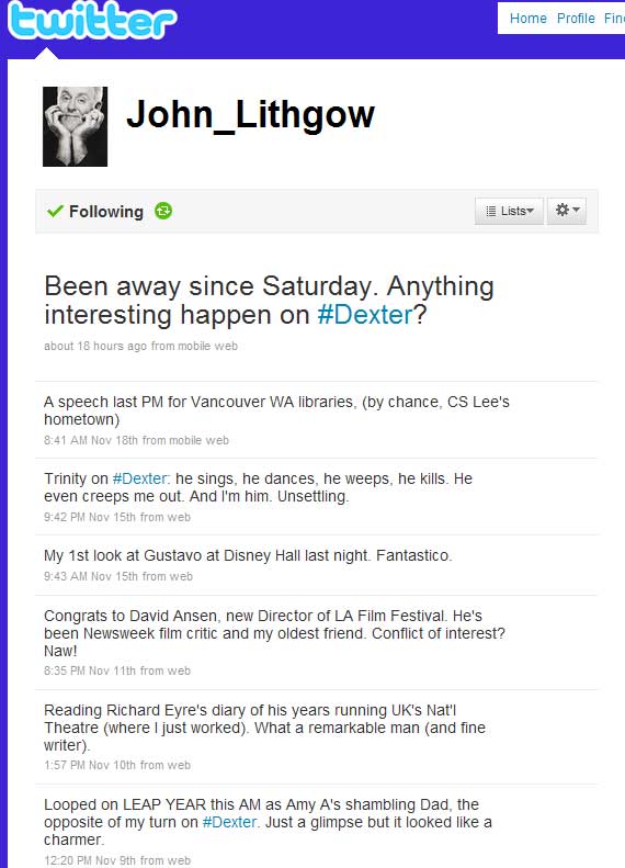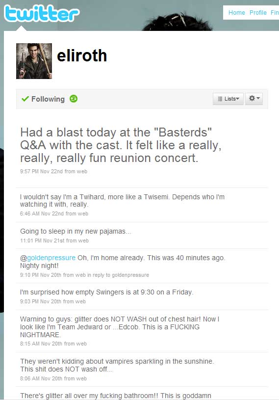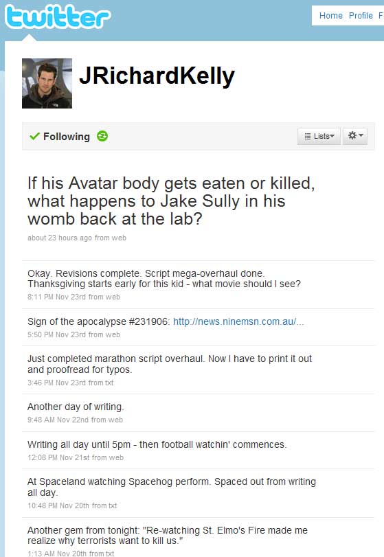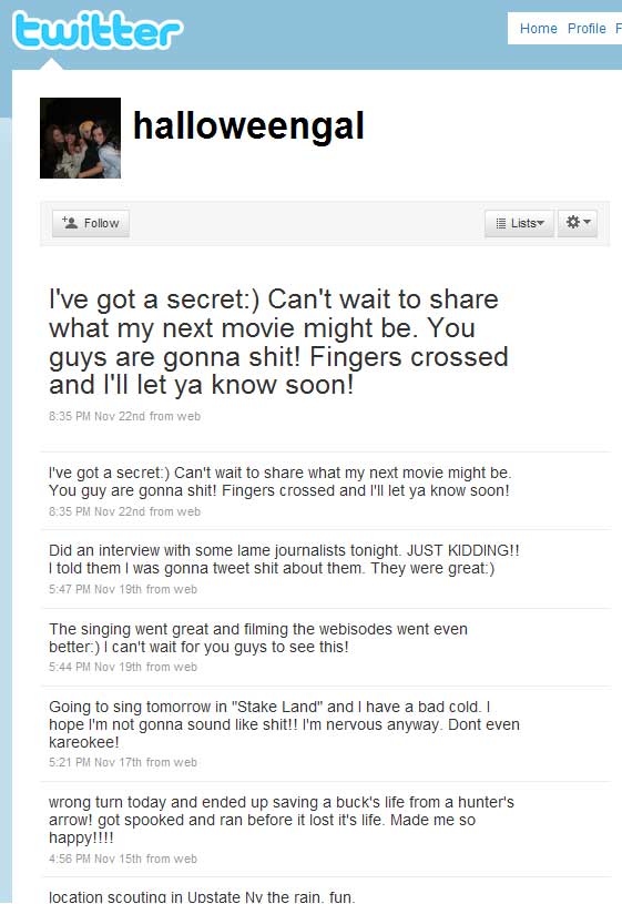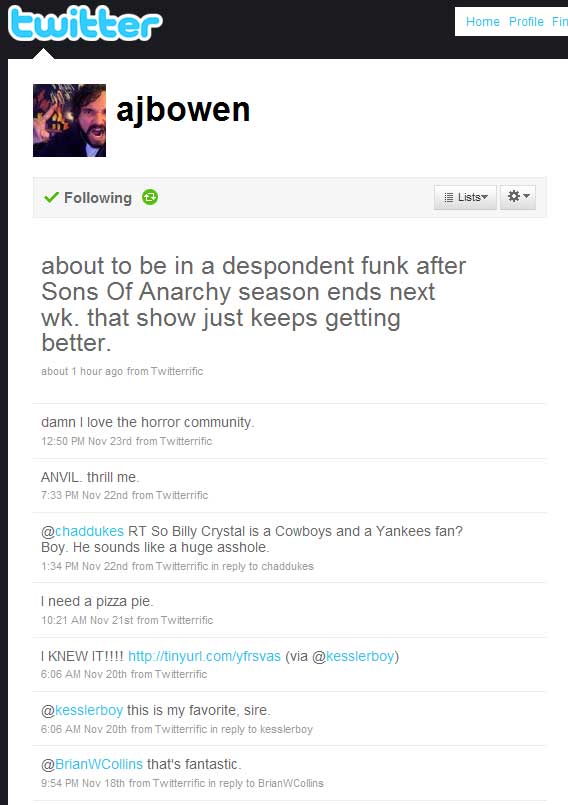 Twitter has been around since 2006. SLiTHER director James Gunn extolled its virtues to me in 2007 at the Saturn Awards, after I told him how much I loved — but missed — his blog on MySpace. He used to do really elaborate, hysterically funny, and totally bizarre multimedia blogs on the social networking site regularly (he still posts them, occasionally). Gunn explained what Twitter was, and he was excited about it but to me it sounded really intrusive and time-sucking. I stayed away.