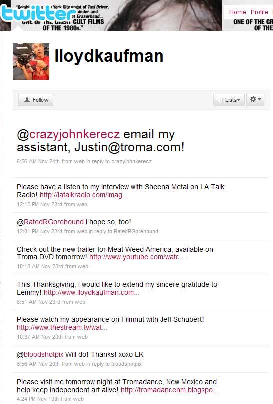 That's where it can become a slippery slope for celebs and filmmakers, because personally I won't follow anyone for very long who does nothing but a) post links or press releases, b) only answers questions from their followers, c) never gives you any insight to themselves as a person, or d) uses the site as a sociopolitical forum for their pontifications.