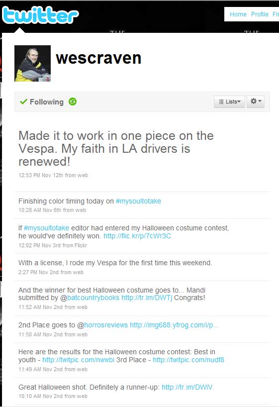 Are you on Twitter? Thinking about it? Overwhelmed, or skeptical? So you don't have to, I've gone to the site this morning and collected screen-caps from all the high profile horror-related feeds I could find. (Hint: You can tell which ones are my personal favorites by the "Following" tag underneath the username!)