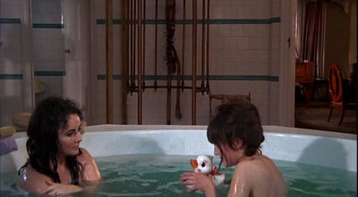 Taylor plays Leonora, a woman who truly is the "Madonna / Whore", as she's a prostitute who was a mom… but is now childless, still grieving years later over the mysterious loss of her daughter, and wondering how, as she grows old, she will be able to make ends meet (so to speak… a little hooker humor, there!). Enter Cenci, played by Mia Farrow, a motherless, mostly mute waif, who takes Leonora into her home. The antiquarian mansion seems to be deserted, and the two women enjoy tea time (Leonora eats like Henry the 8th… a little dig at Taylor's own growing girth?), tunes (Cenci sings an eerie traditional folk tune, Katie Cruel, to her makeshift mum), and even bath-time (rubber duckys and Sappho-zings go hand in hand, here). But their eerie idyll is interrupted when Cenci's stepfather (Robert Mitchum) , intrudes into the make-believe mommy / baby-girl liaison, bringing tragedy upon them all.