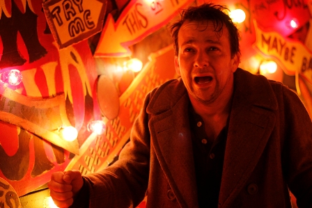 We struggled quite a bit with Lucifer’s look, oscillating over how “human” to make the character. Initially, my devilish pride fought the idea of losing my face entirely in the process, but I ultimately acquiesced to the notion that the character needed to be bigger than life; someone immediately recognizable as The Dark Lord, but, at the same time, specific to our carnival world. Vincent Guastini and his fabulous makeup team came up with the idea of Lucifer’s painted-on jester face. In TDC, Lucifer is a performer, just like the carnies he oversees; his pride requires him to doll up for his audience. I’m not sure I want to know what this says about me.