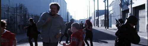 Only, it's not ended yet. Day 3 is toward the climax of the film so I can't give too much away, but in this scene Andrew, Joe, and me are led outside the building by Greg, 'Bardo, and Clare. The city streets are strewn with debris, there's a downed helicopter (which will be added digitally, later… there was a marking on the ground to show where it will be, but I don't have much spidey-sense. Buz: "Staci, you just plowed through the burning wreckage again!"), and Angelinos are running for their lives as the Mega Spider makes her final stand. Greg's Alex character says something like, “I'm just an average guy on his day off, and now it’s all up to me...”