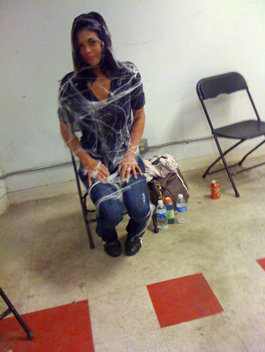 At first I was tied to an office chair (we are all employees of the most unprofessional ilk — we're in jeans and tennies, I guess it was casual Friday… for which I am most grateful, when the running and action scenes are later shot). Then it is decided I should be laying closest to the most glorified extra of them all (again: didn't catch her name, but she was the Fay Wray of our bunch, trussed up standing, as a human sacrifice). So I do that. Then, Buz explains the Mega Spider will be entering the lair, but not before we are rescued by Greg Grunberg and Lombardo Boyar. As I said, Boyar is my own personal knight in shining armor, armed with a lighter and pen-knife to free me from my fatal bonds. Once we are on our feet, the spider sees that lunch is about to get away, and we all dash away.