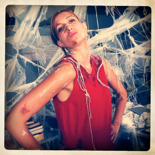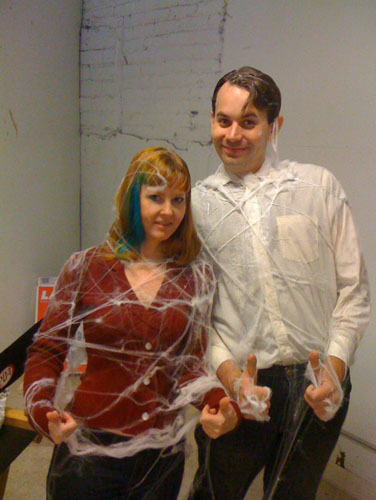 On day one Andrew, Joe, and me — plus a couple of others whose names I didn't catch… hey, it’s not easy to make friends when you’re mummy-wrapped in venomous vines and laying on the floor under hot lights — we are festooned with fake wounds, wound up in off-white webs, and drenched in what's supposed to be spider-placenta. Brought before the director for inspection, he takes one look at us and says (rather unsympathetically I think), “More goo!”